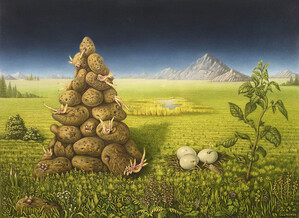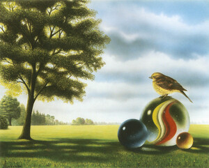 1999Ook hier zien we een realistisch landschap met objecten die buiten proportie zijn. met een extra idee van de kunstenaar, een zieke Geelgors (Nederlandse vogel) die uitrust op de grootste knikker.